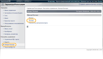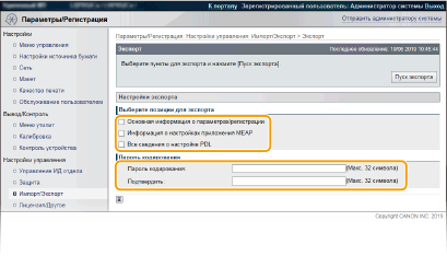 Чтобы экспортировать данные настроек, которые можно задавать с помощью пункта [Параметры/Регистрация] на странице портала, установите этот флажок.