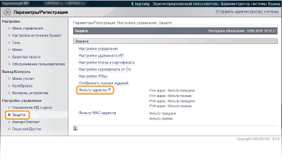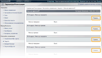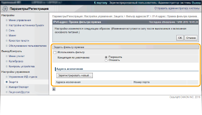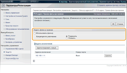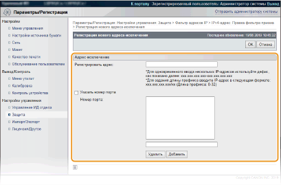 ![]() Изменение установленного IP-адреса в списке исключений Перейдите по соответствующей ссылке в разделе [Адреса-исключения], на отображаемом экране измените параметры и нажмите [OK]. Удаление IP-адреса из списка исключений Выберите IP-адрес для удаления и нажмите кнопку [Удалить]. ![]() | ||||