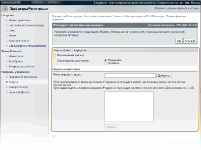 2 | Укажите адреса-исключения. Введите IP-адрес (или диапазон IP-адресов) в поле [Регистрировать адрес] и нажмите [Добавить]. ![]() Проверка на наличие ошибок ввода При неправильном вводе IP-адресов доступ к аппарату из Удаленного ИП может быть невозможен. В этом случае необходимо указать для <Фильтр адресов> значение <Выкл.>. Фильтр адресов ![]() Если выбрано значение [Отказать] в пункте [Концепция по умолчанию] Фильтрация возвратных, многоадресных и широковещательных пакетов невозможна. Удаление IP-адреса из списка исключений Выберите IP-адрес и нажмите [Удалить]. ![]() | ||||