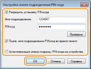 2 | Если необходимо, укажите параметры и нажмите [ОК]. [Разрешить установку PIN-кода] Установите флажок, чтобы использовать PIN-код. [Имя подразделения] Введите номер ИД отдела. [PIN-код] Введите требуемый PIN-код, соответствующий ИД отдела. [Проверка] Щелкните для проверки правильности имени и PIN-кода. Эта функция недоступна, если аппарат подключен к компьютеру через порт USB или WSD (веб-службы для устройств). [Подтв. имя подразделения/PIN-код во время печати] Установите флажок для отображения всплывающего экрана [Подтверждение имени подразделения и PIN-кода] при каждой печати с компьютера. [Аутентификация имени подразд./PIN-кода на устройстве] Установите этот флажок, если аппарат и компьютер подключены через порт USB или WSD. |