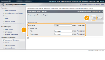 2 | Укажите необходимые параметры и нажмите [OK]. [ИД отдела] Введите номер ИД отдела, который требуется зарегистрировать. [Задать PIN] Чтобы задать PIN-код, установите флажок и введите одинаковые числа в текстовые поля [PIN] и [Подтвердить]. |