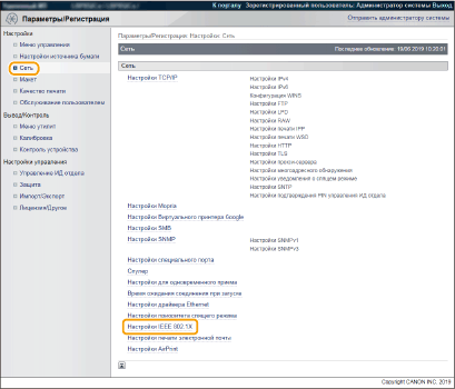 Аппарат подключается к сети 802.1X в качестве клиентского устройства. Типичная сеть 802.1X включает сервер RADIUS (сервер аутентификации), коммутатор LAN (аутентификатор) и клиентские устройства с аутентификационным ПО (запрашивающие устройства). При подключении к сети стандарта 802.1X устройство должно пройти аутентификацию пользователя для подтверждения того, что подключение установлено авторизованным пользователем. Данные аутентификации передаются на сервер RADIUS для проверки. В зависимости от результатов этой проверки устройство может или не может быть подключено к сети. Если аутентификация не пройдена, коммутатор сети ЛВС (или точки доступа) блокирует доступ внешнего устройства к сети.