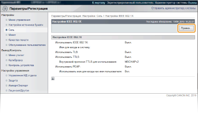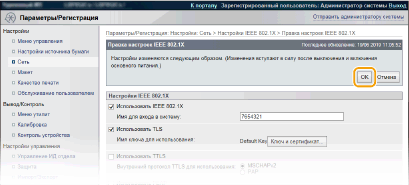 Использование панели управленияАутентификацию IEEE 802.1X можно также включать и отключать из меню настройки на панели управления. IEEE802.1X |