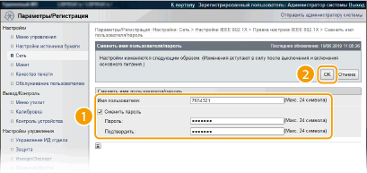 3 | Правильно задайте имя пользователя/пароль и щелкните [OK]. [Имя пользователя] Введите алфавитно-цифровые символы для имени пользователя. [Сменить пароль] Чтобы задать или изменить пароль, установите флажок и введите алфавитно-цифровые символы для нового пароля в обоих текстовых полях: [Пароль] и [Подтвердить]. |