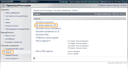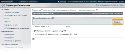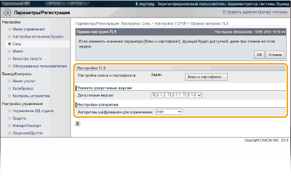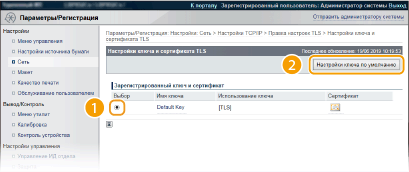 Если протокол TLS уже включен в разделе [Настройки удаленного ИП] или [Настройки печати IPP], пункт [Настройки ключа по умолчанию] не отображается. Чтобы изменить используемый ключ, см. шаг 6 и снимите флажки [Использовать TLS] в разделах [Настройки удаленного ИП] или [Настройки печати IPP], соответственно.
