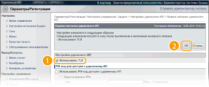 3 | Установите флажок [Использовать TLS] и щелкните [OK]. [Использовать TLS] При использовании протокола TLS для связи с Удаленным ИП установите этот флажок. Если этот протокол не используется, снимите флажок. |