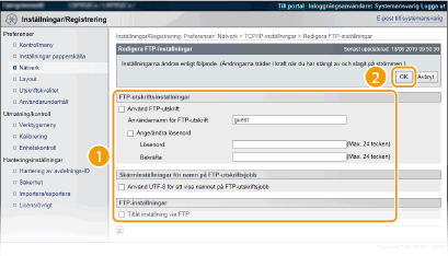 Markera kryssrutan om ändring av enhetens inställningar ska vara tillåtet via FTP-klienten. Avmarkera kryssrutan om ändring av inställningar inte ska vara tillåtet.