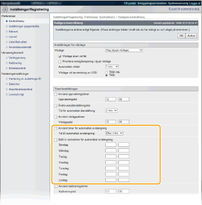 Markera kryssrutan för att stänga av enheten efter den tidsperiod som anges i [Tid till automatisk avstängning].