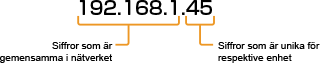 En IP-adress består av fyra tal som avgränsas med punkt (.) (t.ex. 192.168.1.45). Varje tal måste finnas i intervallet 0 - 255. I allmänhet är de tre första talen desamma som för routern eftersom dessa är gemensamma för nätverket. Ange det sista talet (t.ex. 45 i 192.168.1.45) så att det är unikt för enheten.