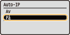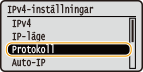3 | Välj <Använd DHCP>, <Använd BOOTP> eller <Använd RARP> och tryck på . Du kan endast använda ett av protokollen DHCP, BOOTP och RARP. Om det valda protokollet anges till <På> anges de två övriga protokollen automatiskt till <Av>. |