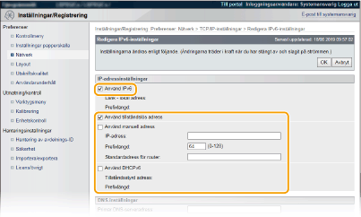 ![]() | Enhetens IPv6-adresser kan konfigureras via fjärranvändargränssnittet. Innan du anger IPv6-adresser ska du kontrollera inställningarna för IPv4-adressen (Ange IPv4-adress). Du måste ange rätt IPv4-inställningar för att kunna använda IPv6-adresser. Enheten kan använda följande IPv6-adresser: |