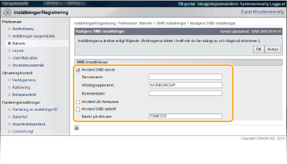 Använda kontrollpanelenDu kan även aktivera eller inaktivera SMB-servern på kontrollpanelens inställningsmeny. SMBDu kan även aktivera eller inaktivera SMB-utskrift på kontrollpanelens inställningsmeny. SMB |