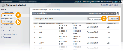 Statusen för alla utskriftsjobb visas oavsett inställningarna i Hantering av avdelnings-ID. Fabriksinställningarna förhindrar att vissa åtgärder, t.ex. radera ett dokument som ska skrivas ut eller avbryta en utskrift, utförs i läget för allmänna användare. Om du vill hantera dokument i allmänt användarläge loggar du in i systemhanteringsläge och aktiverar [Tillåt allmänna användares jobbåtgärd]. Tillåta slutanvändare att hantera dokument Om du angett ditt användarnamn när du loggat in i allmänt användarläge visas bara användarnamnet i dina dokument som du skrivit ut. Klicka på [Jobbnr] i pausade och säkra dokument om du vill visa detaljerad information. Du kan kontrollera användarnamn och sidantal för utskrivna dokument. |