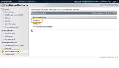 Läs in (importera) data som exporterats från enheten. Du kan även importera inställningar från en annan enhet om det är samma modell som din enhet.