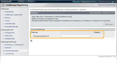 Ange inställningsfilen som ska importeras och ange lösenordet.