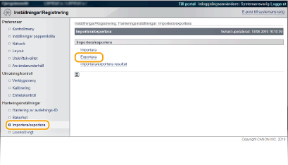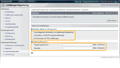 Markera kryssrutan om du vill exportera inställningar som kan anges från [Inställningar/Registrering] på portalsidan.