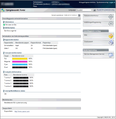 [Systemhanterarläge]Du kan använda alla funktioner och inställningar i fjärranvändargränssnittet. Ange lösenordet för systemansvarig i [Lösenord].