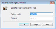 Logga in på enhetenOm du försöker skriva ut från en dator när Hantering av avdelnings-ID har aktiverats visas följande pop-up-skärm (om inte kryssrutan [Bekräfta avdelnings-ID/PIN-kod vid utskrift] är avmarkerad): | | |