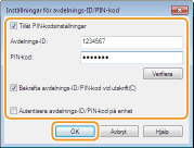 2 | Ange inställningarna efter behov och klicka på [OK]. [Tillåt PIN-kodsinställningar] Markera kryssrutan för att aktivera PIN-kodsinställningarna. [Avdelnings-ID] Ange avdelnings-ID. [PIN-kod] Ange PIN-koden för avdelnings-ID om det behövs. [Verifiera] Klicka här för att verifiera att rätt ID och PIN-kod har angetts. Denna funktion är inte tillgänglig om enheten och datorn är kopplade via USB- eller WSD-port (Web Services on Devices). [Bekräfta avdelnings-ID/PIN-kod vid utskrift] Markera kryssrutan för att visa pop-up-skärmen [Bekräfta avdelnings-ID/PIN-kod] varje gång du skriver ut från datorn. [Autentisera avdelnings-ID/PIN-kod på enhet] Markera kryssrutan om enheten och datorn är anslutna via en USB- eller WSD-port. |