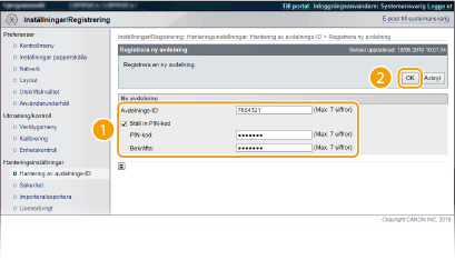 Registrera ett avdelnings-ID och ställ in en PIN-kod för det. Registrera samtliga avdelnings-ID som ska användas.