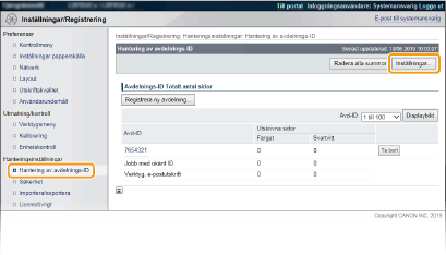 Klicka på [Hantering av avdelnings-ID] och registrera eller redigera avdelnings-ID.
