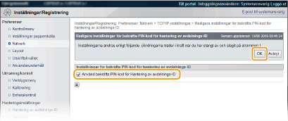 Markera kryssrutan [Använd bekräfta PIN-kod för Hantering av avdelnings-ID]