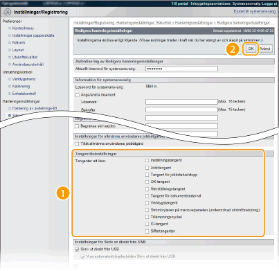 Du kan markera kryssrutan för att låsa en knapp även när den är nedtryckt på kontrollpanelen. Avmarkera kryssrutan för att låsa upp knappen. Du kan även låsa inställningsknappen från kontrollpanelen (
