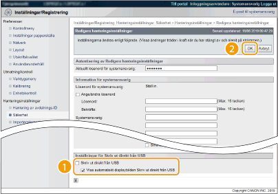 Avmarkera kryssrutan för att inaktivera direktutskrift från ett USB-minne. Markera kryssrutan för att aktivera utskrift från ett USB-minne. Om du även markerar kryssrutan [Visa automatiskt displaybilden Skriv ut direkt från USB] visas skärmen för USB-direktutskrift när ett USB-minne ansluts till enheten.
