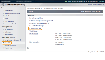 Använda kontrollpanelenDu kan även aktivera eller inaktivera IPSec-kommunikation på kontrollpanelens inställningsmeny. IPSec |
