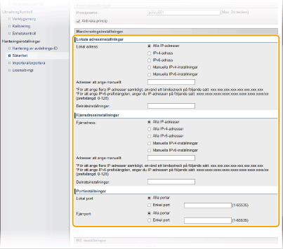 Om du väljer [Manuella IPv4-inställningar] eller [Manuella IPv6-inställningar] i [Lokal adress] anger du IP-adressen för att använda policyn.