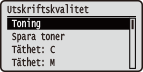 Justera tonerdensiteten vid utskrift för respektive CMYK-färg. Den här inställningen visas inte när <Spara toner> är inställt på <På>.
