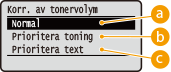 Du kan finjustera tonerdensiteten vid utskrift separat för tre olika densitetsområden. Den här inställningen visas inte när <Spara toner> är inställt på <På>.