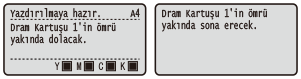 Bu mesaj size, gösterilen yuvadaki drum kartuşunun yakında değiştirilmesi gerektiğini bildirir. Hazırda yedek drum kartuşu bulundurduğunuzdan emin olun. Büyük bir işi yazdırmaya başlamadan önce bu mesajı görürseniz drum kartuşunu değiştirin.