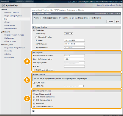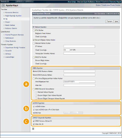 2 | IPv4 DNS ayarlarını yapılandırın. ![]() [DNS Ayarları][Birincil DNS Sunucu Adresi] Bir DNS sunucusunun IP adresini girin. IP adresini ayca işletim panelinden de (IPv4 Ayarları) ayarlayabilirsiniz. [İkincil DNS Sunucu Adresi] İkincil bir DNS sunucusunun IP adresini girin. IP adresini ayca işletim panelinden de (IPv4 Ayarları) ayarlayabilirsiniz. [Ana Bilgisayar Adı] DNS sunucusuna kaydedilecek makinenin ana bilgisayar adı için alfasayısal karakter girin. [Alan Adı] Makinenin ait olduğu etki alanının adı için alfasayısal karakter girin, örn. "örnek.com". [DNS Dinamik Güncelleme] Makinenin IP adresi her değiştiğinde, DNS kayıtlarını dinamik olarak güncellemek için onay kutusunu seçin. [mDNS Ayarları][mDNS Kullan] Bonjour tarafından kabul edilen mDNS (çok noktaya yayın DNS), DNS kullanmadan ana bilgisayar adını bir IP adresi ile ilişkilendirme protokolüdür. mDNS'yi etkinleştirmek için onay kutusunu seçin ve [mDNS Adı] metin kutusuna mDNS adını girin. Bu onay kutusu yalnızca [IPv4 Kullan] onay kutusu seçildiğinde seçilebilir. [DHCP Seçenek Ayarları][Ana Bilgisayar Adı Al] DHCP sunucusundan ana bilgisayar adını almak üzere Seçenek 12'yi etkinleştirmek için onay kutusunu seçin.Ayrıca, işletim panelinden bir ana bilgisayar adı alınıp alınmayacağını da belirtebilirsiniz. (IPv4 Ayarları). [DNS Dinamik Güncelleme] DHCP sunucusu üzerinden DNS kayıtlarını dinamik olarak güncelleştirmek üzere Seçenek 81'i etkinleştirmek için onay kutusunu seçin. Bir DNS dinamik güncelleştirmesi yapılıp yapılmayacağını ayrıca işletim panelinden de (IPv4 Ayarları) belirtebilirsiniz. [DNS Sunucu Adresini Al] DHCP sunucusundan bir DNS sunucu adresi almak üzere Option 6'yı etkinleştirmek için onay kutusunu seçin. [Etki Alanı Adını Al] DHCP sunucusundan bir etki alanı adını almak üzere Option 15'i etkinleştirmek için onay kutusunu seçin. [WINS Sunucu Adresini Al] DHCP sunucusundan bir WINS sunucu adresi almak üzere Option 44'ü etkinleştirmek için onay kutusunu seçin. |
