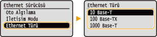 3 | Ethernet türünü seçin. <Ethernet Türü> öğesini seçin Ethernet türünü seçin ![]() ![]() ![]() <1000 Base-T> öğesini seçtiğinizde, İletişim Modu> öğesi, Tam Dubleks> öğesine değiştirilir. |