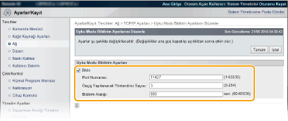 2 | [Bildir] onay kutusunu seçin ve gerekli ayarları belirtin. ![]() [Bildir] Aygıt yönetim yazılımına makinenin güç durumunu bildirmek için onay kutusunu seçin. [Bildir] seçildiğinde, makinenin uyku modundayken gereksiz iletişimi önlemesini ve toplam güç tüketiminin azaltılmasını bekleyebilirsiniz. [Port Numarası] Bu işleve yönelik bağlantı noktası numarasını ağ ortamına göre değiştirin. [Geçiş Yapılanacak Yönlendirici Sayısı] Bildirim paketlerinin kaç tane yönlendirici iletebileceğini belirtin. [Bildirim Aralığı] Makinenin, aygıt yönetimi yazılımına güç durumunu ne sıklıkla bildirdiğini belirtin. |