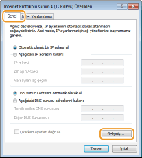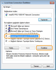 [İnternet Protokolü Sürüm 4 (TCP/IPv4)] veya [İnternet Protokolü] onay kutusunu seçin ve [Özellikler] öğesine tıklayın.