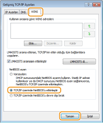 [WINS] sekmesine tıklayın, [TCP/IP üzerinde NetBIOS'u etkinleştir] öğesini seçin ve sonra [Tamam] öğesine tıklayın.