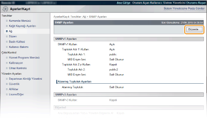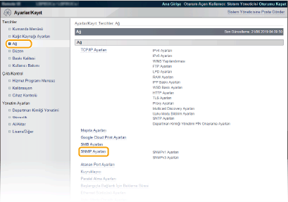 SNMPv1'i Devre Dışı BırakmaSNMPv1 devre dışı bırakılırsa, yazıcı sürücüsü aracılığıyla makine bilgilerini alma gibi makinenin bazı işlevleri kullanılamaz olur. İşletim panelini kullanmaSNMP ayarlarına, işletim panelinin ayar menüsünden de erişilebilir. SNMP Ayarları |