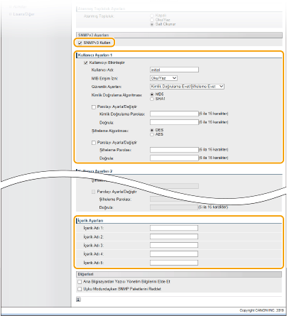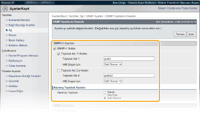 Basit Ağ Yönetimi Protokolü (SNMP), Yönetim Bilgi Tabanı (MIB) kullanılarak bir ağdaki iletişim aygıtlarını izleme ve denetleme protokolüdür. Makine, SNMPv1'i ve güvenliği geliştirilmiş SNMPv3'ü destekler. Belgeleri yazdırırken veya Uzak Kullanıcı Arabirimi'ni kullanırken bir bilgisayardan makinenin durumunu denetleyebilirsiniz. SNMPv1 veya SNMPv3'ü ayrı ayrı veya her ikisini de aynı anda etkinleştirebilirsiniz. Her bir sürümün ayarlarını, ağ ortamınıza ve kullanım amacınıza uyacak şekilde belirtin.
