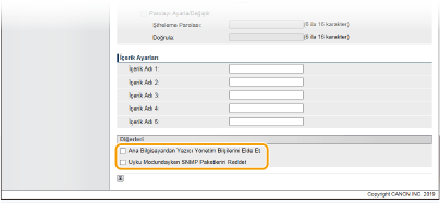 Atanmış Topluluk önceden belirlenmiş bir topluluktur ve iW Management Console gibi Canon yazılımlarını kullanan yöneticiler için özel olarak planlanmıştır. MIB nesnelerine erişim ayrıcalıkları için şu seçeneği [Kapalı], şu seçeneği [Oku/Yaz] veya [Salt Okunur] şu seçeneği seçin.