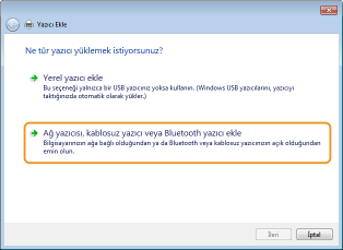 Windows Vista/7/Server 2008 kullanıyorsanız, [Ağ, kablosuz veya Bluetooth yazıcı ekle] öğesine tıklayın.
