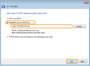[Paylaşılan yazıcıyı adıyla seç] öğesini seçin, bir bağlantı hedefi girin ve [Sonraki] öğesine tıklayın.