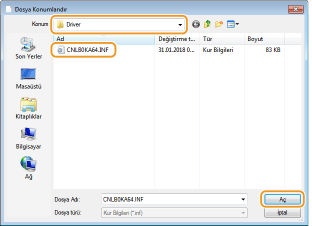 Yazıcı sürücülerinin bulunduğu klasörü belirleyin, INF dosyasını seçin ve ardından [Aç] öğesine tıklayın.