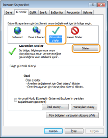 [Güvenlik] sekmesinde [Güvenilen Siteler] öğesini seçin ve [Siteler] öğesine tıklayın.