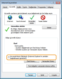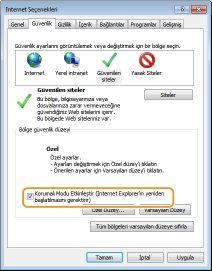 Seçiliyken [Korumalı Modu Etkinleştir (Internet Explorer'ı yeniden başlatmayı gerektirir)] onay kutusunun onayını kaldırın.