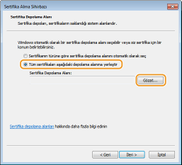 [Tüm sertifikaları aşağıdaki depolama alanına yerleştir] öğesini seçin ve [Gözat] öğesine tıklayın.
