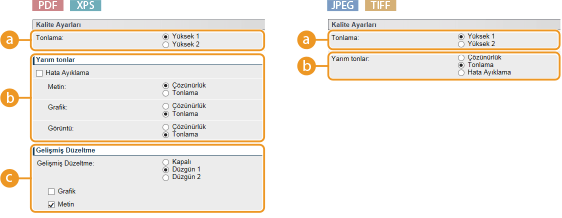 Yarım tonları (görüntünün daha açık ve daha koyu alanları arasında kalan aralık) yeniden üretmek için yazdırma yöntemini seçebilirsiniz. PDF ve XPS dosyalar için [Çözünürlük] veya [Tonlama], bir belgede bulunan her bir resim türü için [Metin], [Grafik], ve [Görüntü] ayarını yapabilirsiniz.