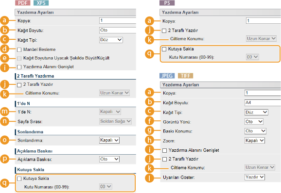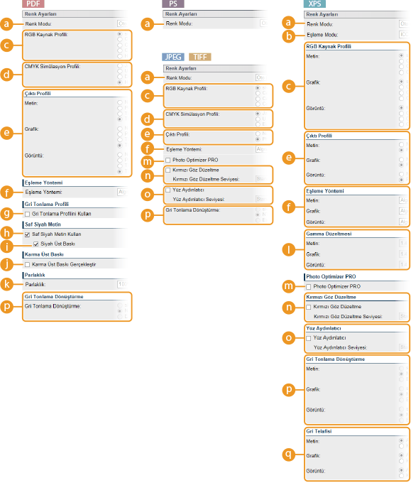 * Açıklamadaki simgeler PDF dosyalarını yazdırma ayarları  PS/EPS dosyaları için yazdırma ayarları  JPEG dosyalarını yazdırma ayarları  TIFF dosyalarını yazdırma ayarları  XPS dosyaları için yazdırma ayarları * Simgeler, dosya biçiminden bağımsız olarak, görüntülenen ayarlar için atlanır. |