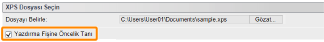 XPS dosyaları için yazdırma ayarlarını belirtirken[Yazdırma Fişine Öncelik Tanı] onay kutusunu temizleyin. Eğer bu onay kutusu işaretli ise, bazı öğeler kullanılamayabilir. |